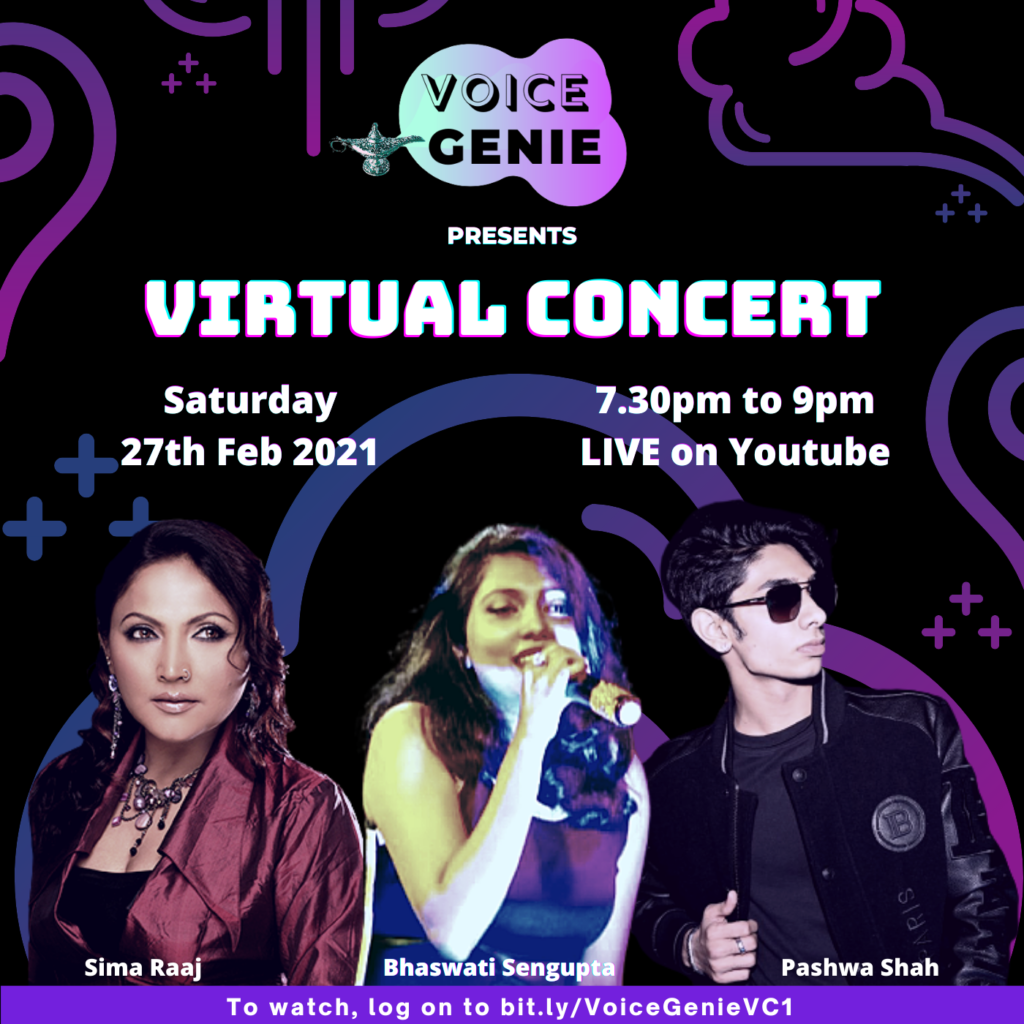 We are so thrilled to start online virtual concerts on our YOUTUBE channel. These live sessions will be be performed at R&B Studios in Mumbai featuring 3 fabulous Voice Genie artists per concert, with a fabulous 30 minutes setlist each!